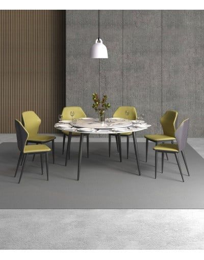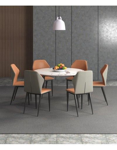 Chất liệu: Bàn ăn mặt tròn, chân làm từ chân ống Ø 50 tóp côn. Khung đỡ mặt bàn bằng thép hộp 25x50, sơn đen sần hoặc kem. Mặt bàn bằng đá ceramic dày 12mm.