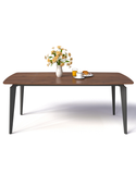 Chất liệu: Bàn ăn chân sắt tạo hình kiểu thanh cài bút, sơn tĩnh điện đen sần hoặc kem. Mặt bàn cốt gỗ plywood dày 18mm phủ melamin 2 mặt. Cạnh bàn vát nghiêng.
