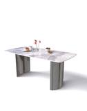 Chất liệu: Bàn ăn chân làm từ inox tấm dập ép tạo hình trăng khuyết màu đen bóng. Khung mặt bàn thép hộp 20x40 sơn tĩnh điện đen sần. Mặt bàn bằng đá ceramic dày 12mm.