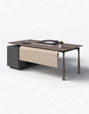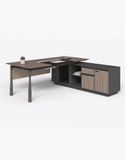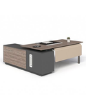 Chất liệu: Bàn lãnh đạo có tủ phụ, mặt bàn gỗ MFC 2 lớp, lớp trên dày 17mm cạnh vát chéo có ghép tấm da ở giữa, lớp dưới dày 25mm. Chân kiểu gậy bóng chày mạ giả inox màu nòng súng liên kết bằng khớp nhôm hợp kim với khung mặt bàn. Yếm bàn làm từ khung sắt bọc da. Có máng điện và ổ điện.