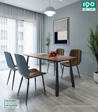 Chất liệu bàn: Bàn ăn chân sắt kiểu gậy bóng chày, sơn đen sần hoặc kem. Mặt bàn cốt gỗ plywood dày 18mm phủ melamin 2 mặt. Cạnh bàn vát chéo.