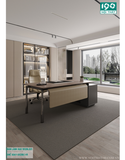 Chất liệu bàn: Bàn lãnh đạo có tủ phụ, mặt bàn gỗ MFC 2 lớp, lớp trên dày 17mm cạnh vát chéo có ghép tấm da ở giữa, lớp dưới dày 25mm. Chân kiểu gậy bóng chày mạ giả inox màu nòng súng liên kết bằng khớp nhôm hợp kim với khung mặt bàn. Yếm bàn làm từ khung sắt bọc da. Có máng điện và ổ điện.