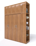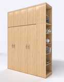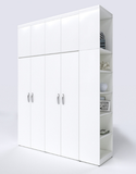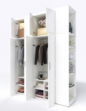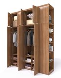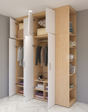 Tủ quần áo gồm 2 khoang cánh mở, mỗi khoang có 1 suốt treo áo và 4 ô để đồ. Tủ phía trên gồm 2 khoang cánh mở. Kệ bên hông tủ được chia làm 6 khoang để đồ trang trí.
